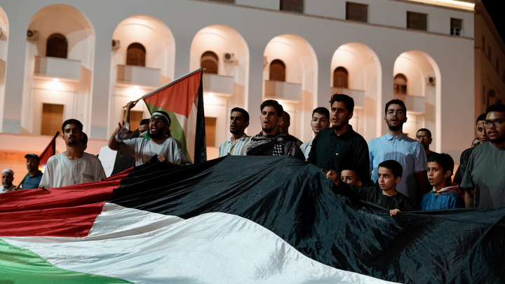 10月1日,民众在利比亚首都的黎波里集会,声援向加沙地带运送人道主义物资的“全球坚韧船队”。“全球坚韧船队”成员包括来自40多个国家的500多名志愿者,他们乘坐约50艘船,寻求打破以色列对加沙地带的海上封锁。