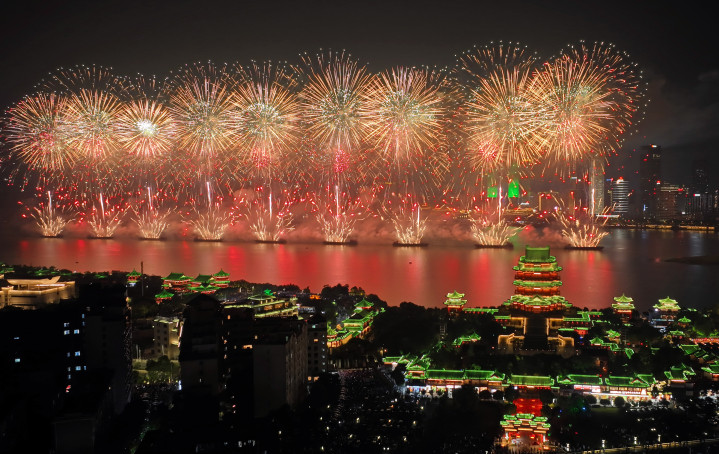 10月1日,2025年南昌市国庆烟花晚会在江西省南昌市赣江老官洲水域举办。国庆节期间,全国多地举行焰火表演,共庆中华人民共和国华诞。